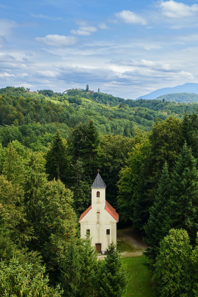 トラコシチャン城のすぐ隣に佇む聖十字架チャペル(Kapela sv. Križa)は、ドラシュコヴィッチ家ゆかりの寄進により建てられた礼拝堂です。バロック古典主義様式の落ち着いた佇まいと、城の周囲を囲む森に溶け込む美しい景観が魅力です。
